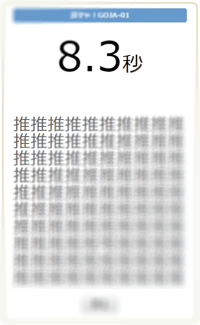 誤植発見早押しゲーム「誤字ゃ!」です。たくさん並んだ同じ文字の中に、ひとつだけ別の文字が紛れ込んでいます。それを見つけてクリックするだけのゲームですが、上部に秒数がカウントされていきますので、できるだけ短時間で見つけてください。