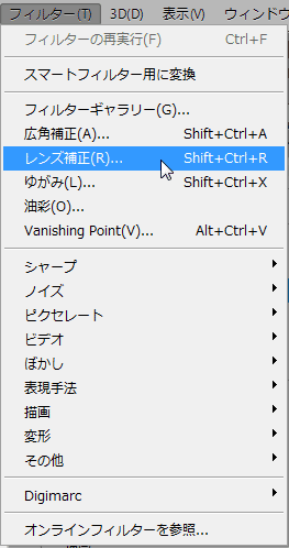 これは、メニュー→フィルター→レンズ補正を選びます。