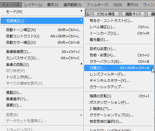 2)Photoshopを立ち上げ、撮影した画像を開いたら、メニュー→イメージ→色調補正→白黒 を選択します。