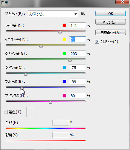 3)レッド、グリーンは右側(明るく)に、シアン、ブルーは左側(暗く)にそれぞれスライドします。どの程度動かすかは、画面を見ながら判断してください。