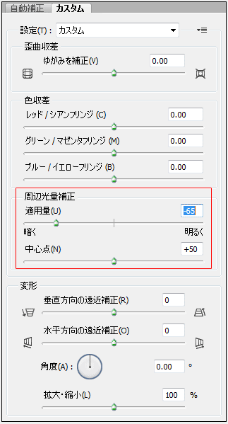 8)カスタムタブに切り替え、「周辺光量補正」の適応量のところを「暗く」(左側)のほうにスライドさせます。
